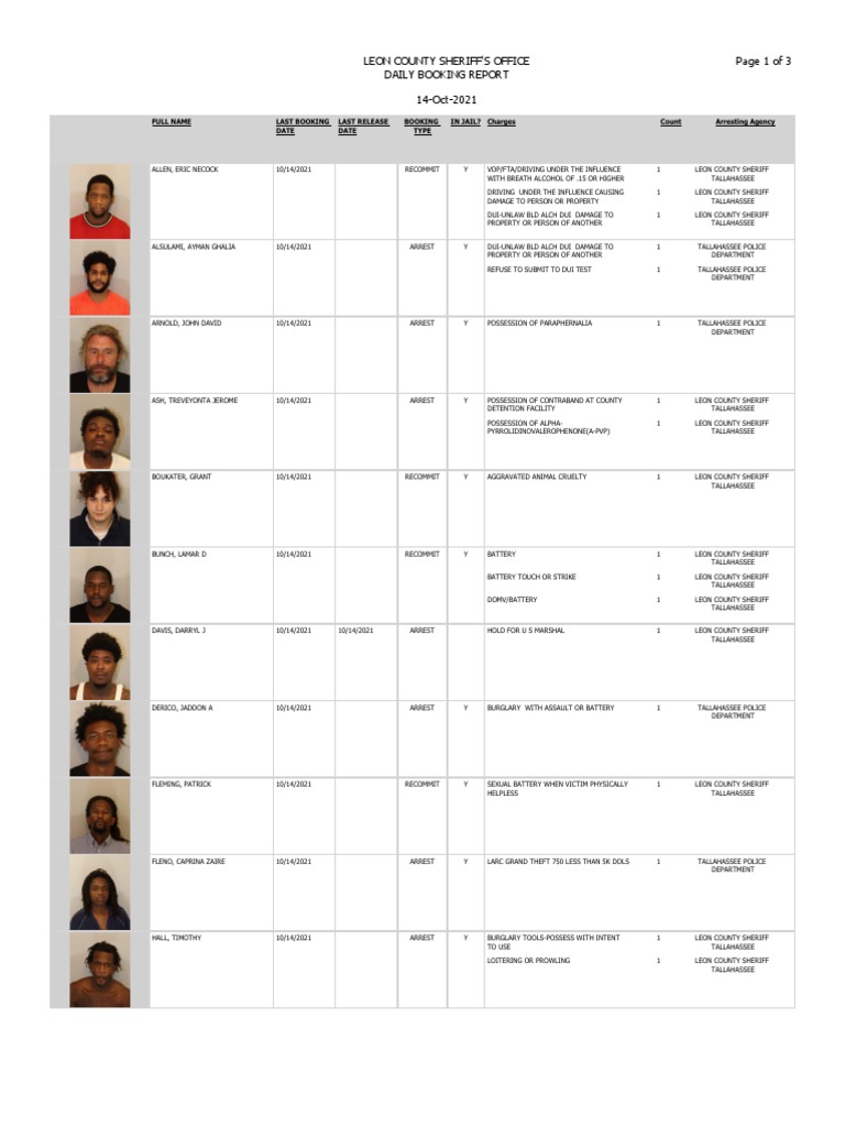 Charges count arresting agency date date type. Leon county sheriffs office page 1 of 2. WCTV - Below is a PDF file containing all bookings at the Leon County Detention Facility from Oct.